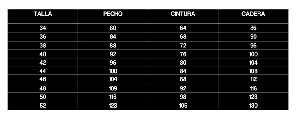*Escríbenos para cualquier otra talla que no se encuentre en esta tabla.